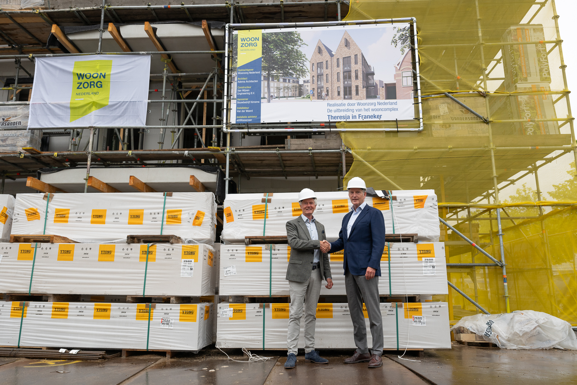 De nieuwbouw van wooncomplex Theresia in Franeker is vandaag gevierd onder het genot van koffie en gebak. Wethouder Kees Arendz van gemeente Waadhoeke en Woonzorg Nederland-bestuursvoorzitter Cees van Boven onthulden het bouwbord, waarop de artist impression staat hoe het gebouw eruit komt te zien.