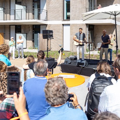Ruim 200 bewoners, naasten, medewerkers, vrijwilligers en andere gasten genoten van het mooie weer en de gezelligheid, maar bovenal van de muzikale optredens van de Wapenzangers en Alain en Dane Clark. Het kunstwerk 'Zeemeermin met kind' heeft een nieuwe plek op het terrein gekregen en werd deze middag onthuld door leden van de cliëntenraad van Huis in de Duinen. Het sierlijke kunstwerk symboliseert het steeds vernieuwende leven en de verbondenheid met het water; Huis in de Duinen.