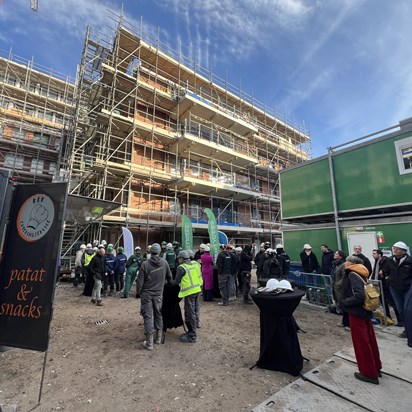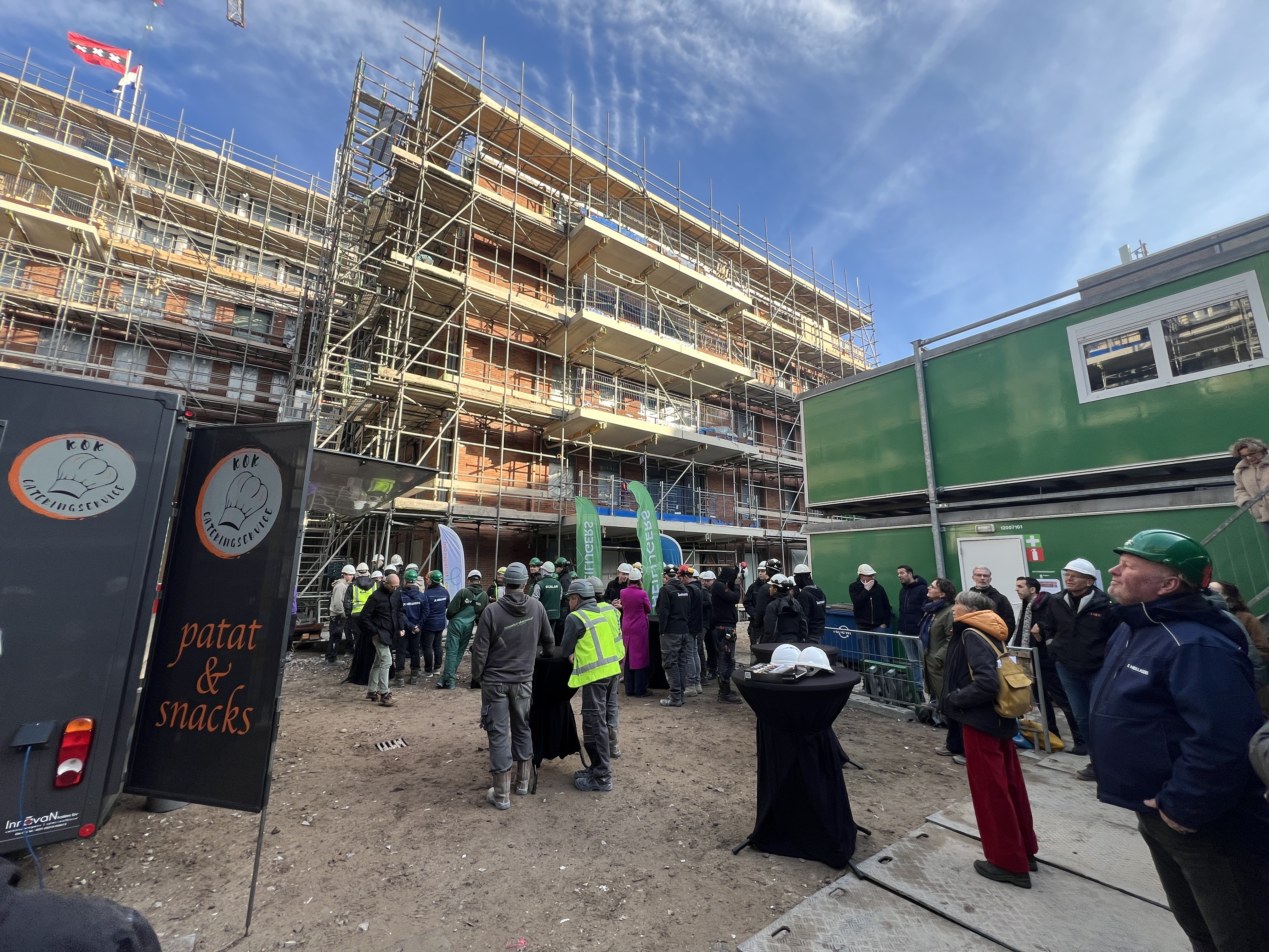De nieuwbouw van woonzorglocatie De Open Hof in Amsterdam-Oost heeft op 4 december jl. het hoogste punt bereikt. Tijdens een feestelijk moment hesen Herman Broekhuizen (directeur bouwbedrijf Heilijgers), Pien de Jong (bestuurder Zorggroep Amsterdam Oost), Dorieke van Steeg (projectontwikkelaar Woonzorg Nederland) en George van der Veer (projectmanager Woonzorg Nederland) gezamenlijk de vlaggen de lucht in. Met dit officiële gebaar werd de mijlpaal op bijzondere wijze gevierd. Een belangrijk moment voor het project aan de Fizeaustraat, waar Woonzorg Nederland samen met ZGAO, Heilijgers en de gemeente Amsterdam bouwt aan toekomstbestendig wonen voor senioren.